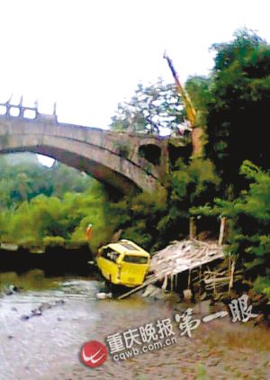 昨中午12時(shí)許,重慶晚報(bào)記者在現(xiàn)場看到,黃色中型客車車頭被撞變形,車身玻璃全部破碎,已經(jīng)從橋底被吊車吊上橋面。