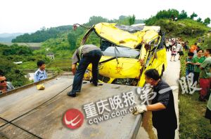 昨日,是梁平縣和林鎮(zhèn)的趕場天,四面八方的村民前往場鎮(zhèn)趕場。上午9時(shí)20分左右,一輛車牌號(hào)為渝F9067*的黃色中型客車從該鎮(zhèn)三龍水庫出發(fā),載著村民趕往鎮(zhèn)里。在該鎮(zhèn)三龍水庫團(tuán)魚凼下坡轉(zhuǎn)彎路段,客車突然失控,撞破石橋欄桿后,墜下近10米高的橋洞,落入水庫閘門水潭邊。事故造成3名大人和一名6歲孩子死亡,9人受傷。