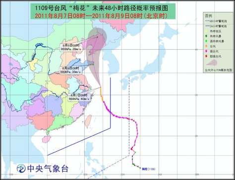 受“梅花”影響,8月7日14時至8日14時,渤海東部、渤海海峽、黃海、山東半島及其沿海、遼寧沿海、江蘇沿海、東海北部將有7~9級大風,黃海部分海域、山東東部沿海風力可達10~11級,“梅花”中心經(jīng)過的附近海面的風力有12~13級,陣風可達14~15級,浙江東北部及沿海、上海、杭州灣、長江口將有6~8級大風;江蘇東部、山東半島和遼寧南部等地有大到暴雨,局部地區(qū)有大暴雨。