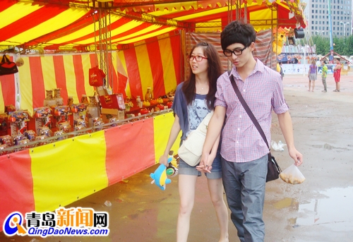 ????雨中,一對(duì)對(duì)情侶相互依偎在傘下行走,頗有雨中漫步的浪漫氣息,形成啤酒城內(nèi)一道道獨(dú)特的風(fēng)景。來自韓國(guó)的吳承澤和他的女朋友首次來到啤酒節(jié),恰巧觀賞到雨中啤酒城的清新爽快,直呼“太好了”。