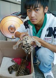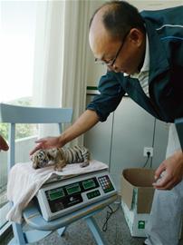 青島森林野生動(dòng)物世界一只7歲的東北虎產(chǎn)下三胞胎 ? 新聞提示 8月21日,青島動(dòng)物園的11歲母虎產(chǎn)下“三胞胎”,昨天,青島森林野生動(dòng)物世界又傳來(lái)消息,一只7歲的東北虎早晨6時(shí)也產(chǎn)下了“三胞胎”,短短一個(gè)月,我市的虎族喜添“6丁”。然后,令人著急的是,野生動(dòng)物世界的7歲東北虎因?yàn)榈谝淮萎?dāng)媽媽,缺乏帶崽經(jīng)驗(yàn),出現(xiàn)棄崽的情況。情況危急,工作人員及時(shí)把母虎與虎崽分離,施行人工喂養(yǎng)。工作人員告訴記者:“小虎崽,吃不到動(dòng)物初乳,會(huì)有生命危險(xiǎn),如果有市民家的寵物狗剛生崽,可當(dāng)小老虎臨時(shí)媽媽,幫它們渡過(guò)難關(guān)?!?/p> 喜 7歲虎媽產(chǎn)下三胞胎 最近一周來(lái),森林野生動(dòng)物世界工作人員好不忙活,園區(qū)內(nèi)的7歲東北虎進(jìn)入預(yù)產(chǎn)期即將產(chǎn)崽,工作人員實(shí)行24小時(shí)監(jiān)控確保母虎安全生產(chǎn)。昨天凌晨,母虎產(chǎn)房傳出一陣嘈雜的聲音,到早晨6時(shí)左右,工作人員發(fā)現(xiàn)母虎作蹲體狀,產(chǎn)下了一只小老虎,隨后又產(chǎn)下一只??赡苁且?yàn)轶w力不支,這只母虎又躺了下來(lái)。工作人員此時(shí)看到,母虎用舌頭舔舐著兩只小老虎,兩只小老虎長(zhǎng)不過(guò)幾十厘米,如同小貓一般大。 上午8時(shí)左右,第三只小老虎順利產(chǎn)下后,母虎躺在產(chǎn)房?jī)?nèi)休息,但奇怪的是,這只母虎把3只幼崽棄在一邊不管不問(wèn)。可憐的3只小老虎嗷嗷待哺,卻吃不到“媽媽”的初乳。 急 暗語(yǔ)勸走母虎救虎崽 動(dòng)管部部長(zhǎng)張雙歌馬上意識(shí)到,這只母虎可能第一次產(chǎn)崽,缺乏帶崽經(jīng)驗(yàn),不會(huì)喂養(yǎng)孩子,如果長(zhǎng)時(shí)間這樣,3只小老虎生命不保?!鞍研』⑨瘫С龌\子,實(shí)行人工喂養(yǎng)。”張雙歌立即組織工作人員試圖將幼崽取出產(chǎn)房。老虎是猛獸,在生產(chǎn)后如果見到生人或者是受到驚嚇,有可能出現(xiàn)吃崽情況。 這怎么辦?此時(shí)張雙歌想到,這只母虎曾經(jīng)是表演虎,特別聽馴獸師的話,他找來(lái)馴獸師,由他用專門的暗語(yǔ),把這只剛生產(chǎn)的虎媽媽勸到另外的籠子。果然這個(gè)辦法奏效,母虎聽到馴獸師的指令后,拖著疲憊的身體,到了另外籠子內(nèi)休息。工作人員趁機(jī)沖進(jìn)產(chǎn)房,把3只虎崽送到專門的育幼室。 樂(lè) 3只小老虎個(gè)個(gè)挺精神 因擔(dān)心剛出生的小老虎受涼,工作人員找來(lái)“熱太陽(yáng)”,提高了育幼室的溫度,很快房間內(nèi)的溫度就達(dá)到了20多度。3只小老虎趴在紙箱內(nèi),簇?fù)碓谝黄?,相互取暖。工作人員根據(jù)以往的經(jīng)驗(yàn)判斷,剛出生的小老虎身體比較弱,需要補(bǔ)充葡萄糖,便把葡萄糖灌進(jìn)了奶瓶,喂給小老虎喝。不知道是因?yàn)闆]有吃上初乳的原因,還是受到驚嚇,小老虎們始終不肯張嘴喝葡萄糖。無(wú)奈,工作人員把小老虎捧在手中,輕輕敲開它的嘴巴,這才把葡萄糖喂到小老虎的嘴里。很快3只小老虎就喝下了半奶瓶葡萄糖。 工作人員稱了稱,這3只小老虎體重最重的兩斤,最輕的1斤左右,目前身體狀況良好。記者了解到,這些小老虎可是國(guó)寶級(jí)的動(dòng)物,他們將安排兩名工作人員24小時(shí)照看3只幼虎,按時(shí)給它們喂奶。 抱起百獸之王如同抱只小貓 體驗(yàn) 威猛的老虎,剛出生就如同一只可愛的小貓,完全看不到它兇狠的一面。都說(shuō)老虎的屁股摸不得,但記者昨天有幸抱到了剛出生的小老虎。 記者洗手后,征得工作人員同意,輕輕抱起了其中一只小老虎,只見它的眼睛閉著,無(wú)法看清東西,四肢也沒有力氣。“別看它現(xiàn)在很弱小,一年后就是猛獸之王了?!睆堧p歌說(shuō)。話剛說(shuō)完,記者抱著的小老虎就掙扎起來(lái),4只爪子伸開后露出了百獸之王的特性,原來(lái)它的爪子剛出生就能有一厘米長(zhǎng)。張雙歌告訴記者,10天后小老虎就能睜開眼睛。 小老虎的媽曾經(jīng)是明星 揭秘 張雙歌告訴記者,這3只小老虎的媽媽曾經(jīng)是個(gè) “明星”。據(jù)悉,現(xiàn)在森林野生動(dòng)物世界的猛獸區(qū)一共有5只老虎,一公四母?!斑@只剛當(dāng)媽媽的東北虎今年7歲了,以前在表演場(chǎng)內(nèi)生活,是表演明星,能夠表演很多精彩的節(jié)目,后來(lái)年齡大就退役了,在猛獸區(qū)內(nèi)安家?!?/p> 張雙歌說(shuō),這只東北虎剛進(jìn)入猛獸區(qū),就受到了10歲虎王的青睞,今年6月這只東北虎懷孕了,懷孕后食欲大增,每天能吃十五六斤肉,其中包括牛肉和雞肉,是平時(shí)飯量的一倍。 認(rèn)狗當(dāng)奶媽才能保安康 行動(dòng) 昨天下午,青島森林野生動(dòng)物世界動(dòng)管部部長(zhǎng)張雙歌告訴記者,目前剛當(dāng)虎媽媽的7歲東北虎身體狀況良好,在工作人員的努力下,3只小老虎已經(jīng)喝下了20毫升的特制牛奶?!皬哪壳皝?lái)看,小老虎的生命暫時(shí)保住了,但是猛獸剛出生后,必須要喝動(dòng)物的初乳,才能健康生活,否則隨時(shí)會(huì)有生命危險(xiǎn)?!睆堧p歌說(shuō),他們?cè)?jīng)遇到過(guò)類似的情況,比如出現(xiàn)獅子和狼棄崽情況,他們找來(lái)剛生產(chǎn)的寵物狗,幫幼獅和狼崽渡過(guò)了生命難關(guān)。 目前,森林野生動(dòng)物世界也在四處找剛生產(chǎn)的寵物狗,