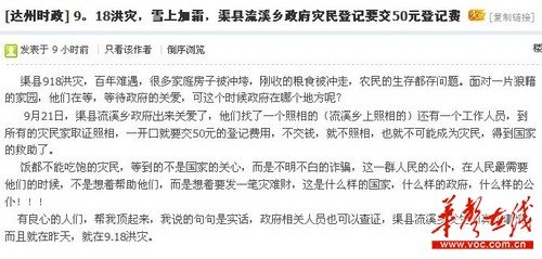 網(wǎng)帖稱,達(dá)州流溪鄉(xiāng)的災(zāi)民需要繳納50元才能領(lǐng)補(bǔ)助。網(wǎng)絡(luò)截圖