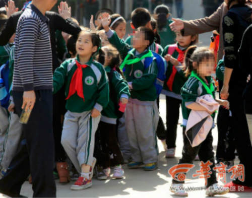 昨日中午放學(xué)后,未央?yún)^(qū)第一實驗小學(xué)門外,一些孩子胸前的綠領(lǐng)巾在人群中顯得格外扎眼 本報記者 張杰 攝