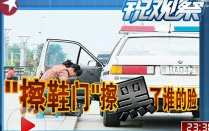 ????10日晚,網(wǎng)友發(fā)微博爆料,一輛警車(chē)停在浙江衢州市路邊,一只腳從警車(chē)伸出來(lái),擦鞋婦女坐在車(chē)門(mén)口為其擦鞋。該微博被網(wǎng)友大量轉(zhuǎn)發(fā)。很多網(wǎng)友譴責(zé)這位警察像“大老爺”。