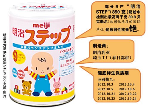 ????明治稱,檢測出銫的是保質期為2012年10月3日、4日、5日、6日、21日、22日、23日、24日的奶粉。保質期顯示在奶粉罐底部。這些奶粉均為埼玉縣春日部市的明治工廠生產(chǎn)。公司稱,可能是在對原料進行干燥處理時混入了大氣中的銫。據(jù)悉,用于制成原料奶粉的牛奶是在福島核電站事故發(fā)生前生產(chǎn)的。