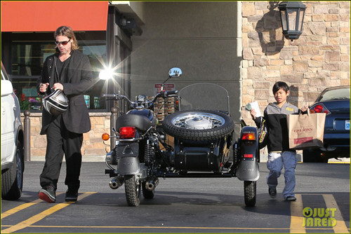 美國加州當?shù)貢r間12月31日正值新舊年交替的時間,巨星布拉德·皮特也沒有閑著,而是帶著自己的8歲大的樣子外出購物。當天的布拉德·皮特身穿一身黑色,而小兒子也是酷勁十足,爺倆騎著布拉德·皮特的復(fù)古摩托車到商店進行大采購,看來是在為新年值班年貨。