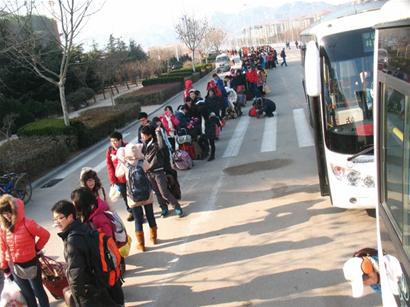 上午9時(shí),記者在隧道1路始發(fā)站前看到,等待乘車(chē)的學(xué)生排起了長(zhǎng)長(zhǎng)的隊(duì)伍,一眼望不到頭,記者粗略估算了一下,隊(duì)伍足有200米長(zhǎng)。隧道1路流水發(fā)車(chē),一輛車(chē)滿了后立即發(fā)走,隨后另一輛跟上,長(zhǎng)龍似的隊(duì)伍在快速移動(dòng)著,不過(guò)由于乘車(chē)的學(xué)生不斷加入,長(zhǎng)隊(duì)看上去似乎沒(méi)有縮短多少,但是秩序井然有序?!拔沂窍挛?點(diǎn)的火車(chē),為了不耽誤乘車(chē),還是早出發(fā)保險(xiǎn)啊。”山科大大二學(xué)生小劉告訴記者,昨天各個(gè)學(xué)院都放假了,大家都迫不及待地想回家,他考慮到坐車(chē)的人肯定很多,所以就提前離校,寧愿早到火車(chē)站候車(chē)也別誤了火車(chē)。
