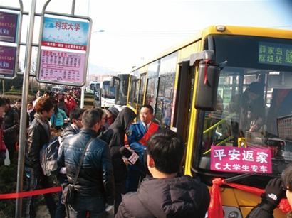 記者隨后登上一輛學(xué)生專車(chē),由于學(xué)生攜帶行李比較多,整個(gè)車(chē)廂里滿滿當(dāng)當(dāng)?shù)?,專?chē)中間不靠站,平時(shí)全程要65分鐘,而專車(chē)到達(dá)火車(chē)站只用了不到40分鐘?!皩W(xué)生專車(chē)真是方便了我們學(xué)生,往年我們光坐車(chē)到輪渡就得40分鐘。”山科大大四學(xué)生田銘下了車(chē)后開(kāi)心地說(shuō),他要乘坐下午3點(diǎn)的火車(chē)回河南老家,本以為路上得花費(fèi)不少時(shí)間,沒(méi)想到12點(diǎn)就到火車(chē)站了。