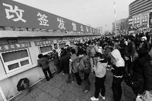 昨天,在北京站臨時搭建的改簽發(fā)售全國各地火車票窗口,旅客們正在有序地排隊購票。首席攝影記者 吳寧/攝