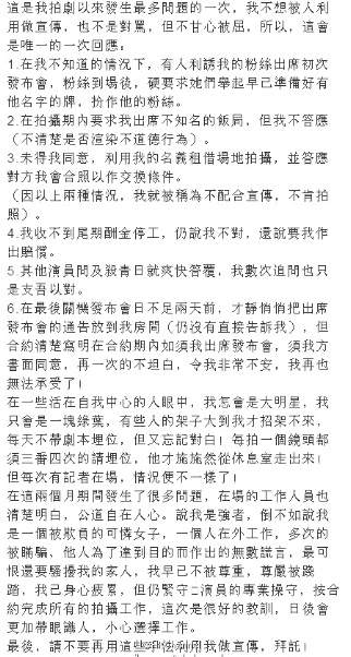 宣萱所發(fā)聲明截圖 近日有媒體報道宣萱缺席《祥子的故事》關(guān)機(jī)宴,稱其和劇組鬧不和,并借機(jī)耍大牌。1月10日晚,宣萱針對此事發(fā)聲明,宣萱在聲明中駁斥劇組各種不妥行徑,其中包括要求她“出席不知名的飯局”、不按時支付尾期酬金等等。宣萱憤怒稱這是她拍劇以來發(fā)生最多問題的一次。 以下是聲明全文: 這是我拍劇以來發(fā)生最多問題的一次,我不想被人利用做宣傳,也不是對罵,但不甘心被屈,所以,這會是唯一的一次響應(yīng): 1.在我不知道的情況下,有人利誘我的粉絲出席初次發(fā)布會,粉絲到場后,硬要求她們舉起早已準(zhǔn)備好有他名字的牌,扮作他的粉絲。 2.在拍攝期內(nèi)要求我出席不知名的飯局,但我不答應(yīng)(不清楚是否渲染不道德行為)。 3.未得我同意,利用我的名義租借場地拍攝,并答應(yīng)對方我會合照以作交換條件。 (因以上兩種情況,我就被稱為不配合宣傳,不肯拍照)。 4.我收不到尾期酬金停工,仍說我不對,還說要我作出賠償。5.其他演員問及殺青日就爽快答覆,我數(shù)次追問也只是支吾以對。 6.在最后關(guān)機(jī)發(fā)布會日不足兩天前,才靜悄悄把出席發(fā)布會的通告放到我房間(仍沒有直接告訴我),但合約清楚寫明在合約期內(nèi)如須我出席發(fā)布會,須我方書面同意,再一次的不坦白,令我非常不安,我再也無法承受了! 在一些活在自我中心的人眼中,我怎會是大明星,我只會是一塊綠葉,有些人的架子大到我才招架不來,每天不帶劇本埋位,但又忘記對白!每拍一個鏡頭都須三番四次的請埋位,他才施施然從休息室走出來!但每次有記者在場,情況便不一樣了! 在這兩個月期間發(fā)生了很多問題,在場的工作人員也清楚明白,公道自在人心。說我是強(qiáng)者,倒不如說我是一個被欺負(fù)的可憐女子,一個人在外工作,多次的被瞞騙、他人為了達(dá)到目的而作出的無數(shù)謊言,最可恨還要騷擾我的家人,我早已不被尊重,尊嚴(yán)被踐踏,我已身心疲累,但仍緊守演員的專業(yè)操守,按合約完成所有的拍攝工作,這次是很好的教訓(xùn),日后會更加帶眼識人,小心選擇工作。 最后,請不要再用這些手法利用我做宣傳,拜托! |