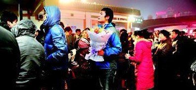 昨晚10時,西安火車站出站口,小張手捧一束鮮花,等著迎接從重慶回來的女朋友。小張說,女朋友在重慶上學,一年中見面的時間不多,眼看她就要回來了,他的心情是又焦急又興奮。本報記者葉原攝