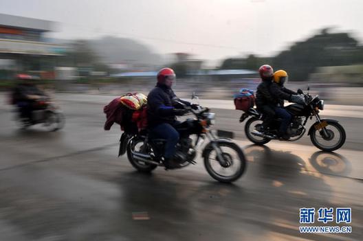 1月11日,在321國道廣西廣東交界路段,外出務工者駕駛摩托車返鄉(xiāng)?! ‰S著廣東珠三角工廠春節(jié)前相繼放假,一批批打工的人們采取騎摩托車的方式返回家鄉(xiāng)。他們匯成的“摩托大軍”成為春運路上一道別樣的風景。新華社發(fā)(何鎏攝)