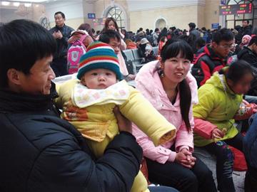走進(jìn)南候車廳,不遠(yuǎn)處一個(gè)年輕媽媽懷抱著一個(gè)只有幾個(gè)月大的寶寶,寶寶穿著嫩黃色的厚棉襖,在媽媽和爸爸的逗弄下,樂得“咯咯”直笑,而寶寶的姐姐卻在一邊旁若無人地啃著雞腿。這一家子來自湖北武漢,爸爸張建新在膠南一家飼料廠從事設(shè)備維修,寶寶名叫張學(xué)志,是他們的第二胎,這才出生5個(gè)月,幾個(gè)小時(shí)后就要和父母一起踏上到漢口的火車,這是他在膠南出生后第一次回老家見爺爺奶奶,在他還不懂得生活的艱辛?xí)r,就成了春運(yùn)大潮中的一員。