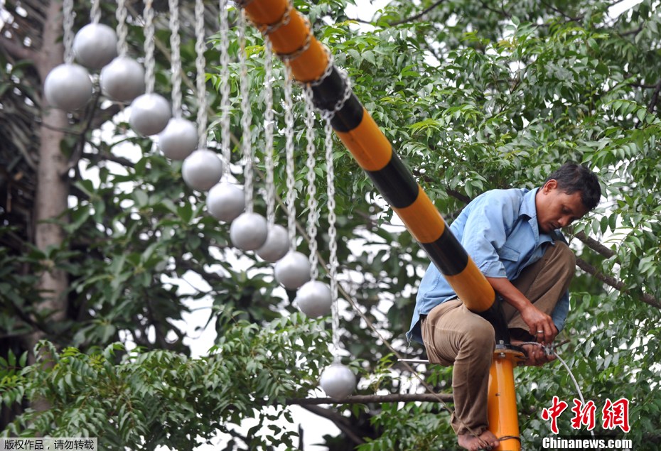 1月17日,印度尼西亞勿加泗,工人在鐵道上方懸掛柚子大小的混凝土球,這是鐵路部門為嚴(yán)懲扒車者而出臺的措施。印度尼西亞勿加泗鐵路部門為嚴(yán)懲扒車者,將水泥球懸掛在距離車頂約40厘米的地方。印尼鐵路部門希望這些巨型球可以斷了乘客扒車的念頭。