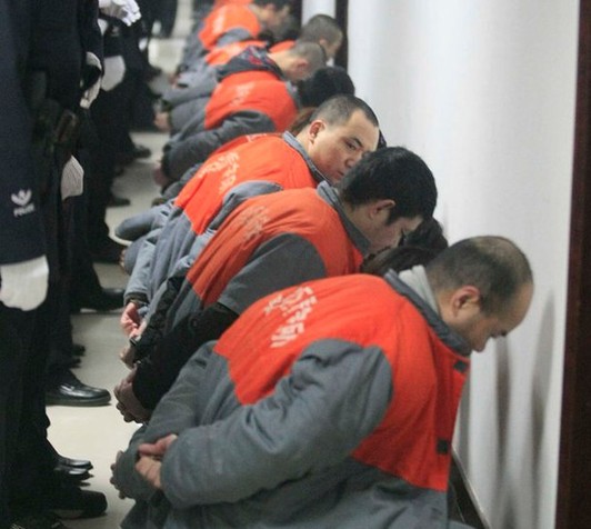 該團(tuán)伙在高級(jí)酒店附近派發(fā)色情卡片招攬嫖客,談好價(jià)錢(qián)用專車送賣(mài)淫女上門(mén)。為便于管理,每名賣(mài)淫女每月還要交納1000元管理費(fèi),每天排隊(duì)上崗。圖為發(fā)卡人員宣判前等待進(jìn)入法庭。