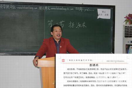 ![]() 52歲的校長修偉良正在給學(xué)員上年前的最后一課 ????“過年少不了喝酒,喝多傷身體,不喝傷感情,如何拒酒又不失禮貌,這就是我們酒桌實用技巧培訓(xùn)班里重要的、我們現(xiàn)在最想學(xué)會的一項課程——拒酒術(shù)。” ????1月19日晚上,哈爾濱市道里區(qū)一家藝術(shù)學(xué)校,52歲的校長修偉良正在給學(xué)員上年前的最后一課,30多名學(xué)員中有企業(yè)老總、公務(wù)員、保險公司業(yè)務(wù)經(jīng)理、美容院老板娘……在并不寬敞的教室中,規(guī)規(guī)矩矩地坐著,認認真真地聽講。 ????這是記者對哈爾濱新聞網(wǎng)報道的這個“拒酒術(shù)”培訓(xùn)班實地探訪時看到的情景。 ????“2009年2月末我們開設(shè)了這個培訓(xùn)班,每期10節(jié)課,一周上一節(jié)。目前已經(jīng)培訓(xùn)了13期200多名學(xué)員,大部分是企業(yè)老總和公務(wù)員,各占3成,另有3成是企業(yè)中層管理人員和白領(lǐng),甚至還有即將畢業(yè)的大學(xué)生,大概有1成左右。今年1月份每節(jié)課費用漲到了198元,但因為快過年了,原本只招15人的班招了30多人?!眰€子并不太高的修校長說話鏗鏘有力,“在2005年開辦藝術(shù)學(xué)校之前,我是司儀?!?/p> ????怎么想到要開辦這樣一個培訓(xùn)班呢?修校長的回答耐人尋味?!熬谱朗侵袊酥匾慕浑H場合,不能喝又不會拒,很多事就辦不成。我酒量也不大,但在酒桌發(fā)現(xiàn)有些跟我一樣的人,一點不壓抑,還挺受歡迎,于是我就觀察、記錄他們的言行,結(jié)合書上的一些知識,自創(chuàng)了這套拒酒術(shù)。” ????修校長的拒酒術(shù)主要包括堅定立場、先聲制人、強調(diào)后果、以健康為擋箭牌、推托家人反對、眾里尋一、好話說盡等七大攻略,并針對敬酒、斗酒、罰酒、勸酒等實際情況總結(jié)了以禮避讓、自我解嘲、李代桃僵、偷梁換柱、移花接木、以情卻酒、避實擊虛等七大案例。 ????修老師還編寫了一些拒酒辭,教給學(xué)員。“只要感情有,啥都能當(dāng)酒”、“只要感情到了位,不喝也會陶醉”、“感情鐵,不用喝得胃出血!感情深,不用喝得打吊針!”、“來時夫人有交待,少喝酒來多吃菜”……“你這么一說,敬酒的人就會為你這些幽默的話而發(fā)笑,你少喝點也就不會影響他的情緒了?!毙扌iL說,“但要記住一點,拒酒術(shù)并不通拒,要區(qū)分好場合和敬酒的人。” ????在當(dāng)天聽課的學(xué)員中,一位穿西服、扎領(lǐng)帶的男子引起了記者的注意。他叫金義,是一家糧貿(mào)集團的董事長,今年61歲?!捌綍r應(yīng)酬太多,為了能夠在酒桌上游刃有余,我參加了首期培訓(xùn)班,學(xué)了拒酒術(shù),還背了幾段拒酒辭,酒來話擋,再適時調(diào)侃一下,效果很好,這么多年下來,沒喝多過一次。妻子看到我的變化后,也來報了名?,F(xiàn)在我倆還經(jīng)常來復(fù)習(xí)?!?/p> ????“我們這個班的課程內(nèi)容不固定,經(jīng)常結(jié)合學(xué)員層次和社會變化進行調(diào)整,所以一些老學(xué)員也常來充電。”該校一位女老師說。 ????李麗,公務(wù)員,36歲,是第13期學(xué)員。“我是女性,只要態(tài)度真誠一點,把‘好話說盡’這一招用好,就能保護好自己,還不會傷害別人。馬上過年了,到時理論聯(lián)系一下實際,以后心里有底,就不怕陪領(lǐng)導(dǎo)喝酒了?!?/p> ????“我學(xué)的是聲東擊西法,別人一個勁勸我喝酒時,我就說一些他感興趣的話題,轉(zhuǎn)移他的注意力,讓他忽視勸酒的初衷,淺嘗輒止。不喝或少喝,效果照樣達到了?!蹦侈k公家具公司總經(jīng)理賈迎春說。(記者 李文學(xué)) |