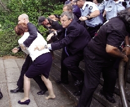 1月26日是澳大利亞國慶日。當(dāng)天,澳大利亞女總理吉拉德在首都堪培拉參加國慶慶典活動時,遭到大約200名土著居民的包圍抗議。在保鏢和防暴警察組成的人墻護(hù)送下,吉拉德安全脫逃,但在慌亂中跑掉一只鞋。圖為保鏢護(hù)送吉拉德撤離。