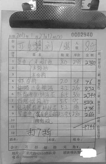 記者看到,這個(gè)菜單的就餐日期是2012年1月27日,“臺(tái)號(hào)”是亞龍灣,就餐人數(shù)是8位。總共點(diǎn)了7道海鮮:墨魚(yú)點(diǎn)了8斤(分椒鹽、辣炒和白灼),單價(jià)298元,共2380元;白灼蝦2斤,共76元;山龜燉湯3.2斤,共832元;一份6.5斤的清蒸鋸緣青(蘭)蚧,2340元;辣炒雞腿螺5.5斤,936元;以及9.5斤的軍曹魚(yú),2660元,共計(jì)9746元。