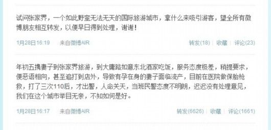 ![]() 微博截圖 大年初五,杭州游客楊先生與妻子王女士前往張家界旅游,在當(dāng)?shù)亍叭缫鈻|北人酒家”就餐時(shí),因?yàn)樽詈笠槐P菜遲遲未上發(fā)生糾紛,轉(zhuǎn)而升級(jí)為肢體沖突。有孕在身的王女士被打后,面臨流產(chǎn)的危險(xiǎn)。 無奈之下,楊先生只能發(fā)微博求助。在政務(wù)微博十大官員之一的龔厚欽等人關(guān)注下,事件引起了張家界市領(lǐng)導(dǎo)的重視,得到了進(jìn)一步解決。 昨天,本網(wǎng)對(duì)此事進(jìn)行了詳細(xì)報(bào)道。 2月2日下午,楊先生和妻子王女士在同事的陪同下回到杭州,身心俱疲的夫婦倆暫時(shí)回家休養(yǎng),不便接受采訪。 陪同的同事金女士告訴記者,她是1月31日看到微博,才獲悉楊先生的遭遇。在電話聯(lián)系后,她和另外兩個(gè)同事一起前往張家界慰問楊先生夫婦,并幫助處理相關(guān)事宜。 由于張家界當(dāng)?shù)蒯t(yī)院的醫(yī)療條件有限,為了能有更好的保胎措施,昨天晚上12點(diǎn),他們一行5人抵達(dá)上海,在上海住了一晚,今天下午坐動(dòng)車返回了杭州。 金女士說,一路上,王女士的肚子一直處于陣痛狀態(tài)。明天,楊先生夫婦將前往省立同德醫(yī)院進(jìn)行全面檢查和相關(guān)保胎措施。 金女士表示,該事件也暫時(shí)告一段落,目前最要緊的是王女士的治療問題。楊先生還是之前的態(tài)度,就是視回杭保胎治療的情況,再追究肇事者的法律責(zé)任。 今天,處理該案的張家界市永定公安分局永定派出所也通報(bào)了最新的處理情況。 2012年1月27日,王女士與餐館王某兩人因糾紛而引發(fā)治安案件,導(dǎo)致王女士懷孕三個(gè)月的胎兒產(chǎn)生一定的影響(具體程度以張家界市人民醫(yī)院的病例為準(zhǔn))。 鑒于此案特殊性,一時(shí)不能處理完畢,經(jīng)派出所辦案人員與雙方當(dāng)事人協(xié)商,暫作初步處理意見:派出所對(duì)以前微博中的不實(shí)之詞及時(shí)予以更正;由店主王某支付王女士因此事產(chǎn)生的費(fèi)用(含張家界市人民醫(yī)院的住院費(fèi)、酒店的住宿費(fèi)、王女士夫婦回杭州的兩張單程機(jī)票);孕婦王某回杭州接受進(jìn)一步的觀察治療;派出所妥善保管此事件的所有證據(jù),并根據(jù)保胎成功與否依法定性本案。 |