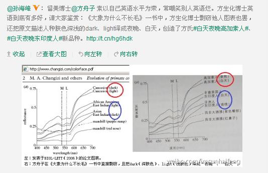 方舟子近日打假韓寒,卻被指作品剽竊 ????方舟子素有“打假斗士”之稱,春節(jié)假期,方舟子質(zhì)疑韓寒之父代筆為子寫作,與韓寒展開隔空“罵戰(zhàn)”,韓寒方面宣布以1000頁的手稿資料作為證據(jù),正式起訴方舟子。不料,方韓之爭還未結(jié)束,“打假斗士”方舟子反被人打假,有網(wǎng)友在網(wǎng)上指出方舟子的作品《大象為什么不長毛》一書中,曾剽竊他人論文中的表格。 ????近日,微博認(rèn)證為深圳大學(xué)傳播系副主任孫海峰的網(wǎng)友在網(wǎng)上爆料,稱方舟子《大象為什么不長毛》一書中剽竊了他人的圖表,更有明顯的翻譯錯誤,文中把描述人種膚色深淺的dark、light譯成夜晚、白天。 ????對此,方舟子暫時未作出回應(yīng)。 ????孫海峰微博原文 ????留美博士方舟子素以自己英語水平為榮,常嘲笑別人英語爛。方生化博士英語到底有多好,請大家鑒賞:《大象為什么不長毛》一書中,方生化博士剽竊他人圖表也罷,還把原文描述人種膚色深淺的dark、light譯成夜晚、白天,創(chuàng)造了方氏白天夜晚高加索人、白天夜晚東印度人新品種。 |