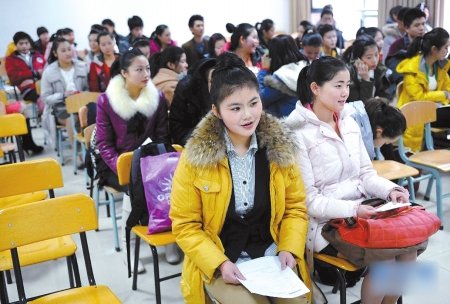 前天上午,記者在播音主持專業(yè)考場外看到,等待入場的帥哥美女一個個穿著專業(yè)的服裝,大多一改以往濃妝的形象,打扮自然清新,素顏以對。