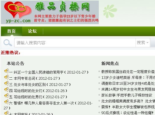 涂世友的貞操網(wǎng)(網(wǎng)頁截圖) ????“無戀史、外表端正、武漢同一高校本,碩,三十幾度春秋悠悠守貞路,氣節(jié)震天撼地,風(fēng)骨超撥絕俗,滾滾功名利祿全當(dāng)浮云眼前飄,陽光又快樂,分享守貞心得,不需飛黃騰達但求心永無愧,為講社會誠信,讓善良的人們消除被愚弄的擔(dān)憂……” ????在一個名為“雅品貞操網(wǎng)”的網(wǎng)站上,簡短的幾十個字成了她的簡歷。她就是這樣一位高學(xué)歷的單身女子,38歲,依然保持著處女身。在網(wǎng)上,她有個名字叫“貞操女神”,為了證明自己,她還在微博上曬出了自己在武漢同濟醫(yī)院的處女鑒定報告。 ????她是一個鄂州女孩,現(xiàn)獨居武漢,靠自由撰稿賺取微薄的收入,卻癡迷宣揚自己的主張。昨日下午,記者采訪到她時,她剛剛從外面散步回來。記者詢問能否在報道中提她的真名,她果斷的回答:可以,我叫涂世友。 ????女碩士自稱“貞操女神” 微博上曬處女鑒定 ????涂世友小學(xué)、初中都在鄂州城區(qū)讀書。在初中時,她的成績總排在年級的前三名。初中畢業(yè)后,她就考取了中等師范學(xué)校。因為當(dāng)時對于學(xué)習(xí)好的學(xué)生來說,能夠讀中專是個不錯的選擇。中專畢業(yè)后,她就被分配到鄂州的一個小學(xué)教書。 ????兩年后,她從學(xué)校辭職,到鄂州的一家企業(yè)從事宣傳工作,干了4年后她報考了武漢大學(xué),成為該校新聞系的插班生。涂世友告訴記者,畢業(yè)后,很多同學(xué)被分配到各個學(xué)校,戀愛、結(jié)婚、生子。而她卻把更多的精力用在了學(xué)習(xí)上。通過自考拿到了??莆膽{。當(dāng)時國家有政策,有??莆膽{的社會青年通過考試可以成為武漢大學(xué)的插班生,2年后,可以和同級大學(xué)生拿到一樣的本科文憑。2001年,她從武漢大學(xué)新聞系畢業(yè),隨后又通過了武漢大學(xué)的碩士研究生招生考試。 ????碩士畢業(yè)后,涂世友留在了武漢,并成為了一名自由撰稿人,平時寫情感文章投給雜志社,或者寫些評論在報刊上發(fā)表。 ????“38年就這么一晃而過了!”涂世友有些感慨。她告訴記者,并不是沒有人追過她,以前在考研究生時,有個和她一起復(fù)習(xí)的男同學(xué)對她有好感。但是,當(dāng)時自己太專心學(xué)習(xí),就沒有太用情?!皩τ诟星?,一切順其自然?!蓖渴烙驯磉_自己的愛情觀。 ????對于自己的處女之身,涂世友變得非常在乎。當(dāng)她把自己是處女的情況告訴一位女性朋友時,對方竟然不信。為了證明自己的“清白”,去年12月,她將自己在武漢同濟醫(yī)院做的處女醫(yī)療鑒定在其騰訊微博公布。在自己的騰訊微博上,涂世友的網(wǎng)名叫“貞操女神”。 ????“其實在做檢查之前,心里承受了巨大的壓力?!蓖渴烙颜f,因為劇烈運動等也會導(dǎo)致處女膜破裂,怕自己鑒定結(jié)果出來后“跳進黃河也洗不清了”,因此在做檢查前的一年時間里,她一直有這樣的擔(dān)心,并為此咨詢過醫(yī)生。 ????去年12月,她來到武漢同濟醫(yī)院,要求婦科醫(yī)生做處女檢查時,還讓坐診的醫(yī)生不禁有些驚訝,“做處女檢查的大多是些年輕的女孩,像我這樣年齡還做處女檢查,醫(yī)生起初以為是故意糊弄她?!钡亲詈筢t(yī)生還是跟她做了檢查,并給她開了“處女膜完整”的醫(yī)學(xué)檢查報告。 ????花千元創(chuàng)建“貞操網(wǎng)” 想勸世人保住婚前貞潔 ????16歲的懵懂少女懷孕做人流弄不清胎兒的父親,只好讓五位“肇事”的男同學(xué)平攤手術(shù)費;高一男生奸殺幼女被判無期徒刑;性的潛規(guī)則已成娛樂圈常態(tài),女大學(xué)生當(dāng)二奶讓越來越多的正義人士陷入批評疲勞不再尖銳抨擊…… ????在兩年前,喜歡看新聞的涂世友被這些社會不良的現(xiàn)象深深震撼。她突然萌發(fā)了一個想法,那就是創(chuàng)建一個網(wǎng)站,宣傳婚前貞潔。 ????對于網(wǎng)絡(luò),涂世友之前并沒有太多的了解。通過咨詢她了解到,創(chuàng)建一個網(wǎng)站需要很大一筆費用,至少要5000元以上。對于靠稿費收入來維持生活的她來說,顯然很難拿出。后來她就找了自己的一個網(wǎng)友。在網(wǎng)友的介紹下,她聯(lián)系上到一位杭州做網(wǎng)站的男生,并告訴了自己的想法。后來兩個人聊得非常投機,這位男生就收她1000元錢為她做網(wǎng)站。在匯了200元錢后,過了幾天,網(wǎng)站就初見雛形。去年的11月份,她的網(wǎng)站“雅品貞操網(wǎng)”才建成。據(jù)她說,這是全國首個“貞操網(wǎng)”。 ????記者瀏覽時看到,她的網(wǎng)站非常簡單,但兩顆紅心圖畫格外引人注目,在“紅心”下面寫有涂世友創(chuàng)辦網(wǎng)站的宗旨:“致力于倡導(dǎo)23歲以下青少年婚前守貞”。網(wǎng)站的內(nèi)容,很多地方提到貞操的問題。 ????涂世友認為,社會轉(zhuǎn)型的嬗變期,部分價值觀的扭曲已經(jīng)波及到了青少年的性觀念,她覺得有必要創(chuàng)辦一個網(wǎng)站,告訴青少年堅守貞操就可以心無旁騖地追逐夢想,也可以避免婚前不當(dāng)性行為帶來的傷害。 ????同時,她也表示,青少年性意識的覺醒和情感的萌動,也需要家長和愛心人士施以健康的價值觀和社交能力來引導(dǎo)。青少年輕率混亂的性經(jīng)歷造成的悲劇越來越多。她想通過“雅品貞操網(wǎng)”分享守貞心得,培養(yǎng)青少年健康的性觀念,遏制道德淪喪性關(guān)系的強