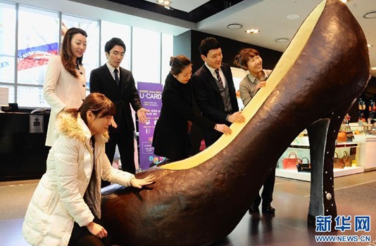2月1日,人們?cè)陧n國(guó)首爾現(xiàn)代百貨店內(nèi)觀看巨型巧克力高跟鞋。當(dāng)日,韓國(guó)首爾現(xiàn)代百貨店展出一只巨型巧克力高跟鞋。這一高跟鞋高2米,使用60千克巧克力耗時(shí)14天制成。為迎接即將到來的情人節(jié),各商家紛紛推出巧克力產(chǎn)品。(新華社發(fā) 樸真熙 攝)