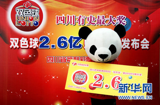 2012年2月14日,中獎(jiǎng)彩民在四川福彩中心領(lǐng)取2.6億巨額獎(jiǎng)金。