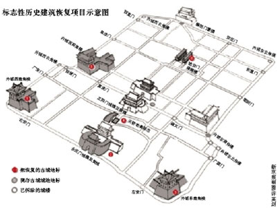 復建后的永定門。本報記者 李飛 攝 本報訊 左安門角樓、右安門角樓等這些建國后被拆毀的城樓舊址,將按照原來的建筑形制,建起新的標志性建筑,讓人們能在地理上對于北京原有的“凸”字形城廓,形成一定的直觀感知。作為建國以來北京最大規(guī)模的“名城標志性歷史建筑恢復工程,北京市準備在6個地點,實施歷史文化名城標志性景觀的恢復。 城樓、角樓建國后拆除殆盡 這6處標志性景觀分別為:北京外城西南角樓、永定門箭樓及甕城、北京外城東南角樓、天橋地表標志、內(nèi)城西南角樓、地安門雁翅樓。 城墻和城樓是北京城最顯眼的標志,但在建國之后,它們中的大部分,因交通等方面的需要,均遭到了毀滅性的拆除,造成歷史遺憾。 時至今日,位于建國門南大街和崇文門東大街相交處內(nèi)側(cè)的東南角樓,是唯一保存下來的北京城的角樓。它處在北京站東南殘留的一段城墻末端,現(xiàn)存角樓建成于明正統(tǒng)四年(1439),此后歷代均有修繕。 6大標志性歷史建筑將重現(xiàn) 經(jīng)元、明、清數(shù)百年建設發(fā)展而形成的北京古都,最突出的歷史文化價值和城市建筑藝術魅力,主要體現(xiàn)在城市的獨特規(guī)劃、整體格局、傳統(tǒng)空間和保存至今的重要歷史建筑群上。 按照《北京歷史文化名城保護規(guī)劃》要求,必須從整體上考慮北京舊城的保護,具體體現(xiàn)在歷史河湖水系、傳統(tǒng)中軸線、皇城、舊城“凸”字形城廓、道路及街巷胡同、建筑高度、城市景觀線、街道對景、建筑色彩、古樹名木十個層面的內(nèi)容。 北京市文物局介紹,北京市政府及東、西城政府將組織實施歷史文化名城標志性景觀的恢復,保持明、清北京城“凸”字形城廓平面,保護好以現(xiàn)狀護城河為標志的外城輪廓及城墻走向,進一步保護和恢復北京古都的整體形象和傳統(tǒng)城市結(jié)構。 并非所有標志性建筑都能恢復 北京擬定建設的古城地標共有6處,從周邊環(huán)境的建設難度考慮,預計最早建成的將是位于左安門的外城東南角樓。6個地標建筑,分別位于右安門、永定門、左安門、天橋、西便門和地安門。建設難度也各有不同。由于建設將選址在舊址,而舊址周邊在幾十年的城市發(fā)展中已經(jīng)發(fā)生巨大變化,因此建設并不容易。有的舊址周邊目前已經(jīng)建成了鐵路,距離舊址僅有幾十米之遙。也有的地方雖然現(xiàn)在是綠地,但也要與有關部門進行協(xié)調(diào)。相比較而言,目前位于左安門附近的外城東南角樓的恢復難度相對較低,預計可以最早開工。 市文物局表示,再現(xiàn)城市輪廓,也要在交通和市政的允許下進行,因此并不是所有的標志性建筑都能恢復。另外,類似天橋地表的標志,未來計劃是把仍存的天橋的橋基進行展示,具體的展示方式也在研討中。 專家 “恢復的是標志,不是文物” 文物專家謝辰生表示已毀壞文物無法恢復 對于此次北京市的“名城標志性歷史建筑恢復工程”,著名文物專家謝辰生表示,按照文物法的要求,不可移動文物已經(jīng)全部毀壞的,應當實施遺址保護,不得在原址重建。但目前如果將其作為一個新建的標志也可以,但必須明確其不是文物。 謝辰生先生說,標志性恢復,首先就不是文物,原來的文物已經(jīng)不存在了,這是肯定的。 但現(xiàn)在作為一個新建的標志,用原來的形制,從標志上是可以的;但不能因此說原來的東西已經(jīng)恢復了,“恢復不了,全不對了。”謝辰生說。 “名城標志性歷史建筑恢復工程”不應是恢復古建筑,只能說是恢復了一個標志,讓原來不知道的人可以看到一個輪廓,這樣做還算可以。 背景 “凸”形城廓意在御敵 北京的外城始建于明嘉靖三十二年(公元1553年)。在內(nèi)城城墻外加建一圈外城,意在增強城池安全,抵御外敵入侵。 由于資金不充足,1564年,北京外城建成,總長只有14公里,開有7座城門,包括永定門、左安門、右安門、廣安門、廣渠門、東便門和西便門。 外城只修建了內(nèi)城南面部分,此后未再擴延,此后的北京城平面輪廓就形成了“凸”字形?,F(xiàn)在二環(huán)路和南二環(huán)路,就是沿“凸”字形輪廓線修建。 【永定門】 公元1564年,為保京城安全,北京外城建成,正門命名為“永定門”,寄寓“永遠安定”。 作為正門,永定門是北京外城7座城門中最大的一座,也是從南部出入京城的通衢要道。永定門的規(guī)模已遠遠大于其他6個外城城門,以雄偉姿態(tài)矗立在北京城中軸線的最南端,直至1957年被拆除。永定門復建于2005年國慶節(jié)前竣工。 【左安門角樓】 緊鄰外城7座城門之一的左安門,在明清時期,外城東南角樓,又稱左安門角樓。 上世紀五十年代,在北京外城整體拆除過程中,左安門角樓也于1955年不復存在。去年9月,東城區(qū)官方網(wǎng)站就復建北京外城東南角樓,進行項目公示和征求意見,外城東南角樓有望2013年原貌重現(xiàn)。 【右安門角樓】 建于明嘉靖三十二年(公元1553年),單檐歇山頂一層的城樓,灰筒瓦頂;面闊三間,進深一間,樓連城臺通高16.6米;南側(cè)、東西側(cè)分別面辟兩層箭窗。1958年完全拆除。 【內(nèi)城西南角樓】 內(nèi)城西南角樓即原西便門的城樓、箭樓、甕城,建于1439年。其結(jié)構與東便門城樓相仿,但高度略低。 建國后,西便門城門、甕城和箭樓被選定為拆除的第一座城門,1952年即被拆除。 1