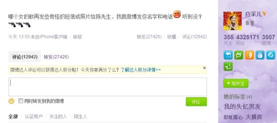應(yīng)采兒霸氣示威情敵 北京時(shí)間2月26日13點(diǎn)50分陳太應(yīng)采兒發(fā)微博向情敵霸氣示威稱:“別再發(fā)奇怪照片給陳先生”,似乎暗示有“情敵”暗中勾引丈夫陳小春。有網(wǎng)友評論其“霸氣側(cè)漏”,圈中好友趙子琪、楊冪也都紛紛轉(zhuǎn)發(fā)應(yīng)采兒微博為她叫好。 應(yīng)采兒在微博上說道:“那個(gè)女的敢再發(fā)些奇怪的短信和照片給陳先生,我就微博發(fā)你名字和電話(憤怒的表情)聽到?jīng)]?”她更是在微博后面還附上了三把手槍的圖片,陳太的憤怒是可想而知。 眾所周知陳小春和應(yīng)采兒的幸福結(jié)合在圈中是出了名的被看好,相戀三年的兩人在得到雙方家人的肯定后于2010年情人節(jié)在美國登記結(jié)婚。此次的陳小春被騷擾事件也讓網(wǎng)友們力挺陳太。大多數(shù)人都被陳太的霸氣宣言所折服,名叫“素面不是葷面”的網(wǎng)友就說:“陳太太好可愛,支持。”更有熱心網(wǎng)友甚至跑到陳小春的微博里面為陳太助陣。 與此同時(shí),得知消息后的圈中好友也都積極站出來力挺陳太,趙子琪就說:“霸氣陳太,各家還有什么高招么?”而楊冪在轉(zhuǎn)發(fā)應(yīng)采兒微博表示支持之余,亦貼心勸告她息怒:“帥呀!挺你!但是但是,息怒呀”。看來大家對應(yīng)采兒的這場“婚姻保衛(wèi)戰(zhàn)”充滿了信心。 應(yīng)采兒和陳小春結(jié)婚兩年,婚后兩人生活一直都很甜蜜,此次得知丈夫被小三騷擾,作為陳小春的正牌夫人,應(yīng)采兒通過微博公開示威,霸氣中不乏可愛。 截止記者發(fā)稿前,該微博已被12605人次評論,26906次轉(zhuǎn)發(fā)。 |