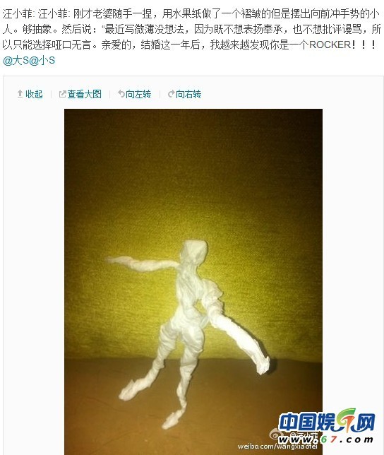 2月28日23:03分,老公汪小菲微博曬出大S用水果紙隨手捏就的褶皺小人,擺出向前沖手勢作啞口無言狀的小人讓汪小菲大呼“夠抽象”,而創(chuàng)意者大S也道出了其中的原委:“最近寫微博沒想法,由于既不想表揚(yáng)奉承,也不想批評(píng)謾罵,所以只能選擇啞口無言?!贝骃富于生活情致的小舉動(dòng),讓老公汪小菲深情感嘆愛妻搖滾范兒十足:“親愛的,結(jié)婚成親這一年后,我越來越發(fā)現(xiàn)你是一個(gè)ROCKER?。?!”不少網(wǎng)友因此力贊大S是個(gè)懂得經(jīng)營生活的才女。