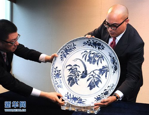 3月5日,蘇富比拍賣行工作人員在展示明朝永樂年制造的青花“荔枝綬鳥”圖大盤,估價(jià)5000萬至8000萬港元。當(dāng)日,蘇富比拍賣行在香港舉行2012年春季中國瓷器拍賣品預(yù)展,展出部分即將拍賣的中國瓷器工藝品。拍賣會(huì)將于4月4日在香港會(huì)議展覽中心舉行。(新華社記者黃本強(qiáng)攝)