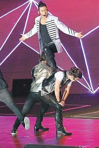 2PM前晚首度在港開演唱胡,澤演(白衣者)與隊(duì)友疊羅漢秀功力。(美聯(lián)社圖片) 2012年3月12日 香港韓國勁爆組合2PM前晚首度在港開演唱會(huì),全場(chǎng)爆滿。六子在演唱會(huì)上大玩舞劍、疊羅漢、側(cè)手翻,又派飛吻送花。澤演在離場(chǎng)前更邊扭屁股邊脫去上衣,半裸跟港迷道別。 2PM前晚在亞洲國際博覽館展開巡唱最后一場(chǎng),六子先后演繹《Heartbeat》及《Again &Again》等二十多首作品。當(dāng)獻(xiàn)唱《Hands Up》時(shí)全場(chǎng)氣氛最為熾熱,樂迷跟隨偶像一起舉手和唱。組合隨后與女舞蹈員表演火辣熱舞,澤演還刻意扯開衣領(lǐng)秀胸肌,場(chǎng)內(nèi)嘩聲四起。 六子情深演繹《Only you》時(shí),大派飛吻,又走近臺(tái)邊送上玫瑰花及握手。燦成在個(gè)人環(huán)節(jié)表演舞劍,峻秀也清唱了數(shù)句張學(xué)友的名曲《我真的受傷了》。六子又表演側(cè)手翻及疊羅漢等多款高難度動(dòng)作,展示身手。 他們最后以《Thank You》一曲答謝樂迷支持,各成員也走近臺(tái)邊,拿起粉絲的寶麗萊相機(jī)玩自拍,并向臺(tái)下拋出毛巾。2PM謝幕時(shí)再三表示會(huì)很快再來香港,燦成與澤演在離場(chǎng)前特地脫去上衣,半裸跟觀眾道別,更把上衣拋給觀眾,兌現(xiàn)他們?nèi)涨邦A(yù)告必定脫衣秀肌的承諾。 澤演蘭桂坊慶功 當(dāng)晚衛(wèi)蘭、鐘一憲、姜麗文等圈中人也有捧場(chǎng),張繼聰也帶上兒子看演出,衛(wèi)蘭更走入后臺(tái)跟2PM合照。此外,澤演被拍得演出結(jié)束后到蘭桂坊慶功,燦成與峻秀則透過twitter表示香港演出很盡興。2PM昨天下午飛回韓國,獲半百歌迷送機(jī),他們經(jīng)由特別通道離去前特地回頭跟粉絲揮手。 |