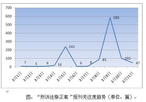 刑訴法大修備受媒體廣泛關(guān)注,3月1日至3月 11日期間國內(nèi)報刊的相關(guān)報道高達1108篇。主流媒體報道,刑訴法修正案草案總結(jié)了司法實踐經(jīng)驗,完善了刑事訴訟中各司法機關(guān)的權(quán)力配置,并堅持懲罰犯罪與保障人權(quán)并重等原則,有望成為中國刑事訴訟法制發(fā)展的新里程碑。一些媒體重點報道刑訴法修正案"從制度上防止刑訊逼供行為的發(fā)生",表明全國人大的立法關(guān)注點順應(yīng)了主流民意,有助于遏制近幾年一些地方傳出的刑訊逼供行為,重申和弘揚司法程序公正。