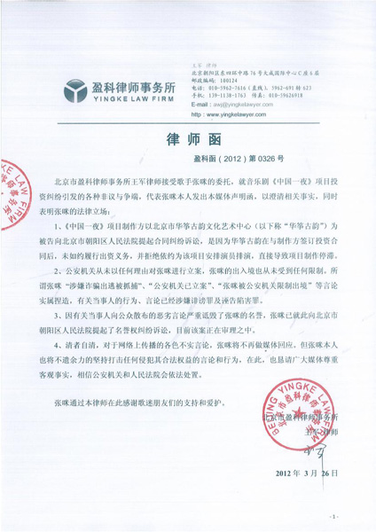 張咪媒體聲明函 日前被媒體高度關(guān)注的張咪“詐騙風(fēng)波”一直未曾平靜,26日,張咪再次委托其律師發(fā)表律師函,向媒體做出聲明,并表明自己的立場。張咪否定了網(wǎng)上傳播的各色不實言論,稱“公安機(jī)關(guān)從未以任何理由對張咪進(jìn)行立案,張咪的出入境也從未受到任何限制”,并表示對相關(guān)當(dāng)事人散布惡劣言論而對張咪名譽(yù)的詆毀向法院提起名譽(yù)權(quán)糾紛訴訟。律師函中還寫道:“張咪將不再做媒體回應(yīng)?!?/p> 律師函原文如下: 律 師 函 盈科函(2012)第0326號 北京市盈科律師事務(wù)所王軍律師接受歌手張咪的委托,就音樂劇《中國一夜》項目投資糾紛引發(fā)的各種非議與爭端,代表張咪本人發(fā)出本媒體聲明函,以澄清相關(guān)事實,同時表明張咪的法律立場: 1、《中國一夜》項目制作方以北京市華箏古韻文化藝術(shù)中心(以下稱“華箏古韻”)為被告向北京市朝陽區(qū)人民法院提起合同糾紛訴訟,是因為華箏古韻在與制作方簽訂投資合同后,未如約履行出資義務(wù),并拒絕依約為該項目安排演員排演,直接導(dǎo)致項目制作停滯。 2、公安機(jī)關(guān)從未以任何理由對張咪進(jìn)行立案,張咪的出入境也從未受到任何限制。所謂張咪 “涉嫌詐騙出逃被抓捕”、“公安機(jī)關(guān)已立案”、“張咪被公安機(jī)關(guān)限制出境”等言論實屬捏造,有關(guān)當(dāng)事人的行為、言論已經(jīng)涉嫌誹謗罪及誣告陷害罪。 3、因有關(guān)當(dāng)事人向公眾散布的惡劣言論嚴(yán)重詆毀了張咪的名譽(yù),張咪已就此向北京市朝陽區(qū)人民法院提起了名譽(yù)權(quán)糾紛訴訟,目前該案正在審理之中。 4、清者自清,對于網(wǎng)絡(luò)上傳播的各色不實言論,張咪將不再做媒體回應(yīng)。但張咪本人也將不遺余力的堅持打擊任何侵犯其合法權(quán)益的言論和行為,在此,也懇請廣大媒體尊重客觀事實,相信公安機(jī)關(guān)和人民法院會依法處置。 張咪通過本律師在此感謝歌迷朋友們的支持和愛護(hù)。 北京市盈科律師事務(wù)所 王軍 律師 2012年 3月 26日 |