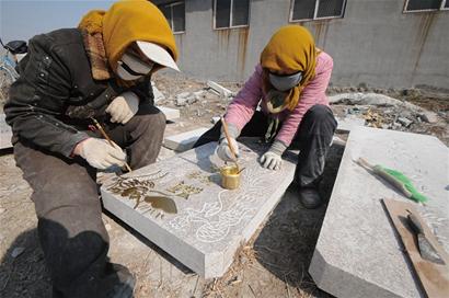 “你看吧,全村到處都是石頭工匠,都在忙著趕活呢,一過清明就不干了?!?月30日上午,記者來到即墨通濟街道北山東村采訪,剛一進村,就看到路邊豎著一塊牌子,上面寫著“刻碑”字樣,還留有幾部移動電話的號碼。一名姓劉的村民邊忙活邊對記者說,這個村祖輩有雕刻墓碑的技術(shù),都傳了100多年了,現(xiàn)在村里有近百戶人家在做墓碑生意。記者看到,道路兩旁,隨處可見正在雕刻墓碑的村民,橫七豎八擺放在路邊的大理石和花崗巖,有的已經(jīng)雕刻完成,有的剛剛被切割成長方塊。