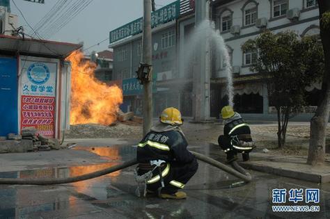 4月5日,馬鞍山消防戰(zhàn)士在天然氣管道泄漏事故現(xiàn)場滅火。當(dāng)日13時40分許,安徽省馬鞍山市雨山西路安民農(nóng)民市場北門口一處天然氣管道發(fā)生泄漏事故,并引發(fā)大火,火焰直噴10米多高并炙烤著上空的萬伏高壓電線,馬鞍山消防部門在排險同時緊急疏散轉(zhuǎn)移了附近上千名群眾。新華社發(fā)(張文正攝)