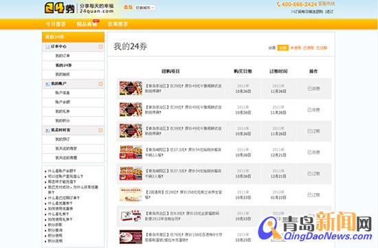 ![]() ????青島新聞網(wǎng)訊 近日,國內(nèi)團(tuán)購網(wǎng)站“24券”被曝網(wǎng)上出售加油卡,中石化方面卻否認(rèn)與其有過此項(xiàng)合作,而此事件的焦點(diǎn)網(wǎng)站“24券”團(tuán)購網(wǎng),更于315維權(quán)日前后,多次被曝出問題事件,網(wǎng)購安全一時(shí)間成為眾網(wǎng)友熱議的話題。3月30日,青島新聞網(wǎng)維權(quán)熱線接到一位網(wǎng)友的反映,她表示自己對僅僅才用了幾個月的“24券”團(tuán)購網(wǎng)感到失望,并稱以后再也不會去該網(wǎng)站團(tuán)購了。記者隨后對此事進(jìn)行了采訪。 ????