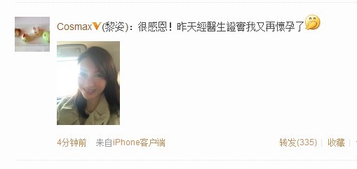4月6日,香港女星黎姿在微博上宣布自己二度懷孕,她興奮地在微博上說:“很感恩!昨天經(jīng)醫(yī)生證實我又再懷孕了?!绷⒖桃齺砹藥装倜劢z的恭喜。