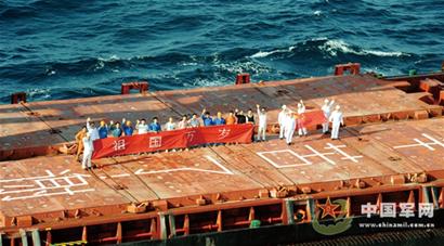 ????為了紀(jì)念此次蘊(yùn)含特殊意義的護(hù)航活動,“祥富門”輪在甲板上涂寫“祖國海軍辛苦了!謝謝你們”的標(biāo)語,“祥華門”號在甲板上打出“祖國萬歲”橫幅和五星紅旗。船員們用海員特有的方式表達(dá)對中國海軍的感激之情。