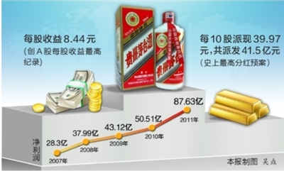 繼五糧液發(fā)布2011年年報(bào)后,貴州茅臺(tái)昨天也發(fā)布年報(bào)顯示,公司實(shí)現(xiàn)營業(yè)收入184.02億元,同比增長58.19%;實(shí)現(xiàn)歸屬于上市公司的凈利潤87.63億元,同比增長73.49%。每10股宣告派現(xiàn)39.97元,成為A股有史以來最高分紅預(yù)案。