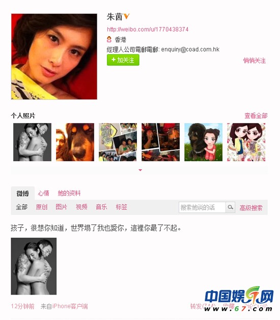 4月17日下午,朱茵微博上傳一張與黃貫中全裸相擁的甜蜜合照,并配以文字“孩子,很想你知道,世界塌了我也愛(ài)你,這里你最了不起?!弊掷镄虚g似乎流露出已有身孕的信息,引來(lái)不少網(wǎng)友猜測(cè),也有眾多粉絲在下面留言祝福以及“催婚”。