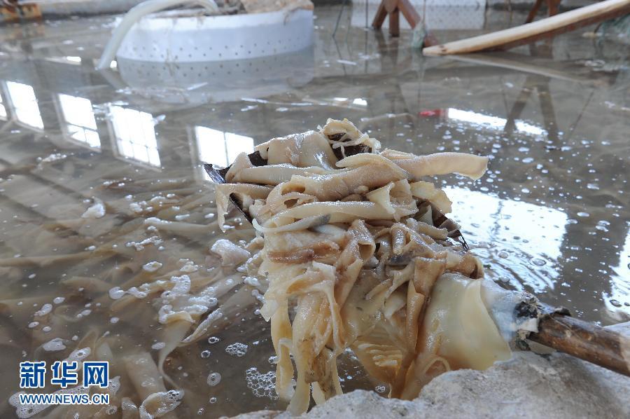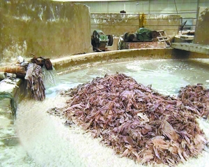 河北阜城縣“學(xué)洋明膠蛋白廠”將工業(yè)明膠銷售到浙江企業(yè)生產(chǎn)藥品膠囊。這種工業(yè)明膠是由經(jīng)過鞣制的皮子下腳料加入石灰后等制成,重金屬鉻含量一般超標(biāo)。圖為:皮子下角料經(jīng)過多次浸泡后變得又白又肥。(記者 王民)