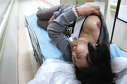 下等著了,現(xiàn)在回想起來,他就是在等我?!弊蛱熘形?2時(shí)左右,記者聞?dòng)嵹s到海慈醫(yī)院時(shí),49歲的高女士正躺在擔(dān)架床上,被丈夫推到放射科等待拍片檢查,她用手捂著右肩,不時(shí)惡心嘔吐,因?yàn)樘弁措y忍,幾次險(xiǎn)些從擔(dān)架床上翻下來。從她扯開的領(lǐng)口處,記者看到她肩胛骨位置有一道青紅色的瘀傷。高女士的家屬告訴記者,同樣的傷痕在她的腿上、后背和腰腹部還有很多道。