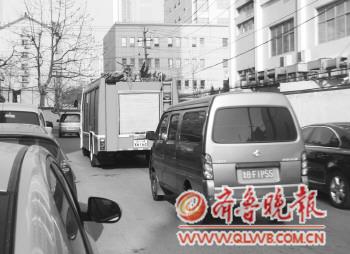 在秀湛二路上,因?yàn)槁穬膳酝M車,消防車無法到達(dá)失火地點(diǎn)。