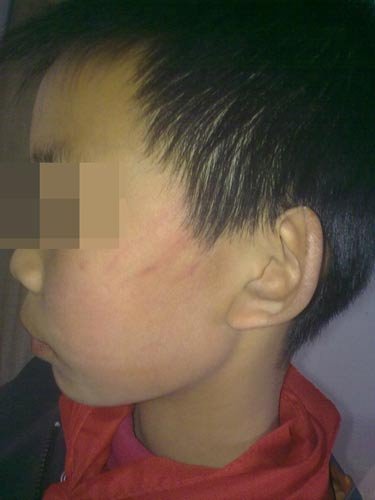 ????4月24號,郭新愛反映情況時,拿出了孩子被打后的照片。一個巴掌清晰地印在左臉上,半個額頭都是發(fā)青的。郭大姐說:“這巴掌是英語老師趙燕燕在上午打的,額頭是班主任焦娜娜下午在辦公室磕的。因為孩子交作業(yè)慢,英語老師就打,掏的慢了就打成這。班主任又把孩子帶到辦公室,說是打死你,叫你給家長說,以后不準(zhǔn)給家長說,再打也不準(zhǔn)給家長說,把頭碰成這樣。孩子晚上就開始哭,不睡覺,第二天去醫(yī)院一檢查,外傷引起心肌酶炎,他媽去派出所說這個事,到那血壓一下子170,這娘倆全住醫(yī)院了?!?/p>