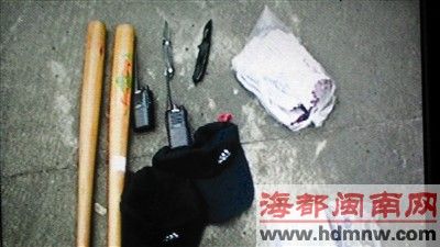 4月24日,專案組在廣東省惠州市發(fā)現(xiàn)另一輛嫌疑車輛蹤跡。專案組民警立即趕赴廣東,第二天,南靖警方在廣東惠州警方的協(xié)助下,在一賓館內(nèi)將4名犯罪嫌疑人全部抓獲,當(dāng)場繳獲棒球棍、匕首、鴨舌帽、對講機(jī)、手套等作案工具。