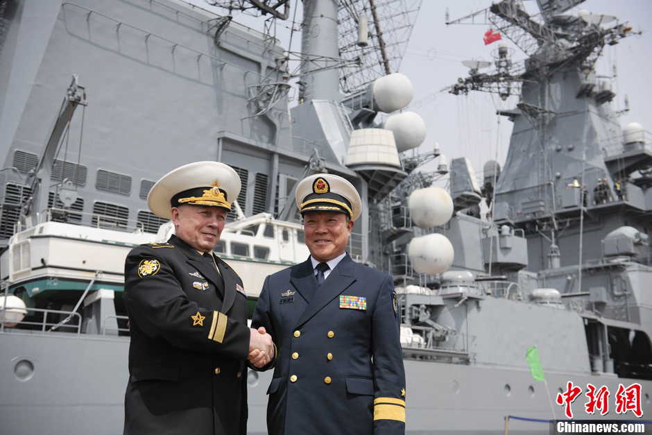 4月27日中午,參加中俄“海上聯(lián)合-2012”海上聯(lián)合軍事演習(xí)的俄羅斯艦艇編隊(duì)離開青島港啟程回國(guó)。中國(guó)海軍官兵為俄羅斯艦艇舉行了隆重的歡送儀式。圖為中國(guó)海軍北海艦隊(duì)副司令員杜希平少將(右)和俄羅斯海軍副參謀長(zhǎng)蘇哈諾夫少將(左)到碼頭送行。中新社發(fā)劉震 攝