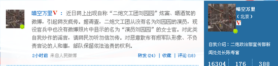 陳壽富在人民微博表示,第二炮兵根本沒有劉園園此人,所謂“二炮文工團劉園園”炫富、曬酒駕純屬虛假炒作。據(jù)調(diào)查,二炮文工團沒有名為劉園園的演員,所屬部隊也沒有微博照片中顯示的名為劉園園的女士官。對此類自我炒作、蠱惑人心的謠言,請網(wǎng)民勿聽勿信勿傳。對惡意散布有損軍隊形象、不負責言論的人和事,二炮保留依法追責的權利。