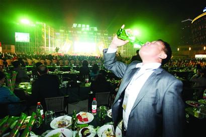 一名市民在青島啤酒激情廣場(chǎng)開懷暢飲。